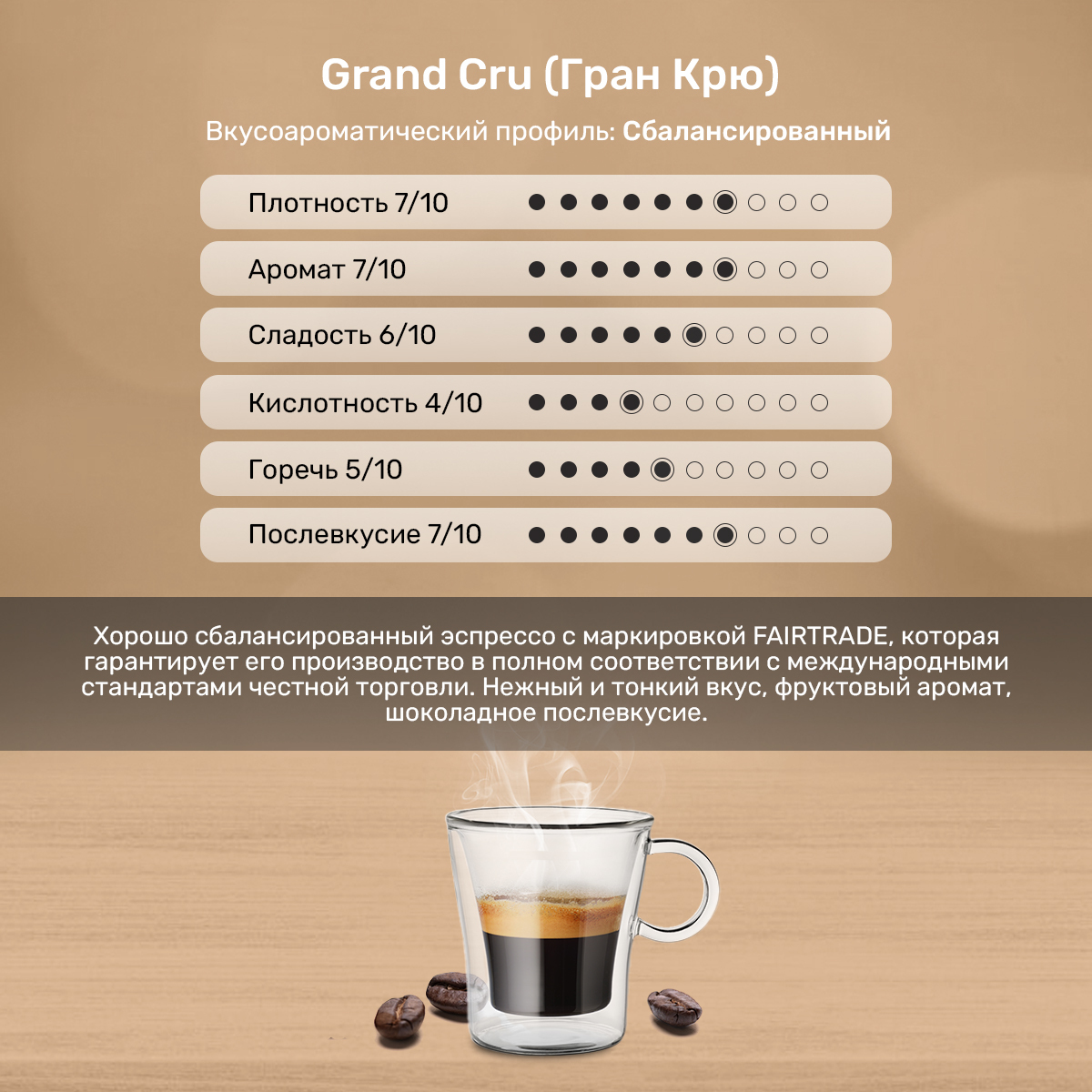 Обжарка: средняя. Интенсивность: 7/10. В капсуле содержится качественный молотый кофе: 8 грамм. Рекомендуемый объем напитка: 25-75 мл.