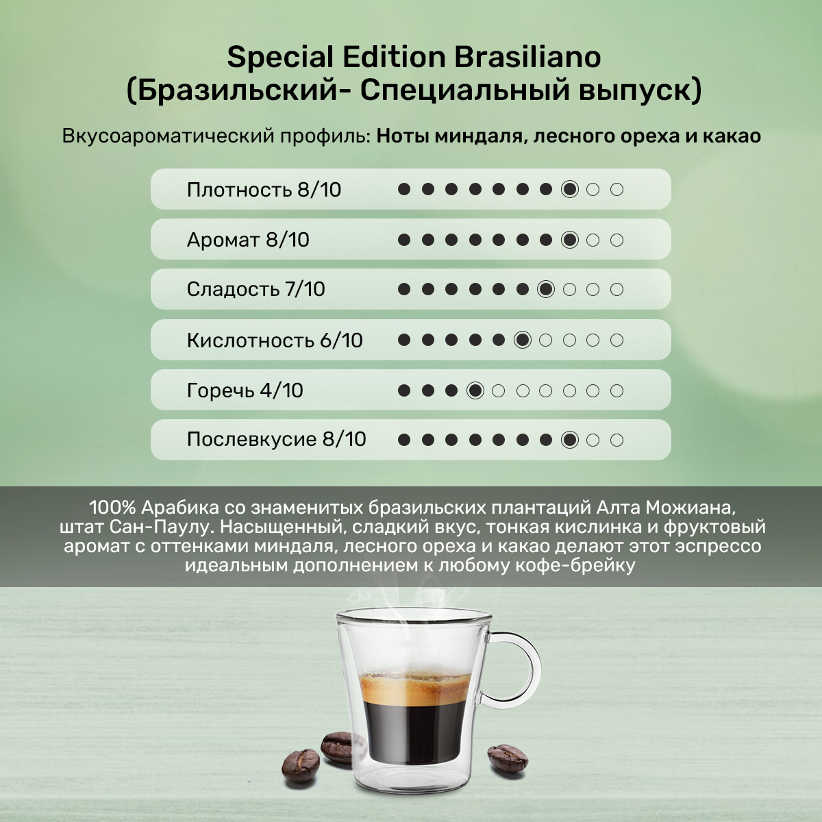 Капсулы для кофемашины Caffitaly Special Edition Brasiliano — Букет напитка формируется ароматом миндаля, лесного ореха, нотками шоколада и цитрусовых. Послевкусие обладает нотами молочного шоколада и марципана. Линейка премиальных капсул кофе в ритме мегаполиса, чтобы продлить наслаждение для самых искушенных ценителей.