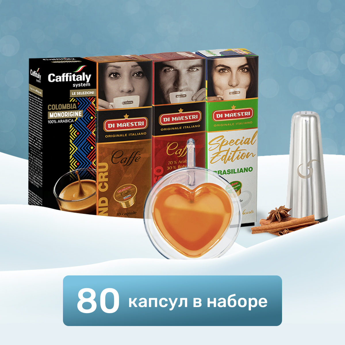 4 роскошных сорта кофе — по 2 упаковки каждого. Откройте для себя яркую и сбалансированную Colombia, насыщенный и сладковатый Brasiliano, утончённый и бархатистый Grand Cru, а также интенсивный и плотный Prezioso.